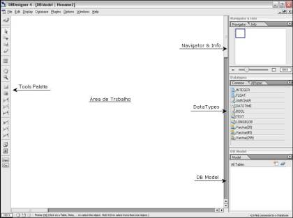 Na Área de Trabalho são inseridas as tabelas e seus respectivos relacionamentos. A Tools Palette contém os componentes mais utilizados na criação e manutenção das tabelas. O Navigator & Info permite o controle da visualização da área de trabalho possibilitando navegar no diagrama. Os DataTypes mostram os tipos possíveis de dados e o DB Model apresenta as tabelas com seus campos e os relacionamentos com outras tabelas.