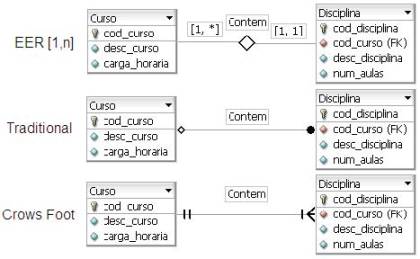 Entretanto, existem outras notações disponíveis e, para alternar entre elas, deve-se utilizar o menu Display / Notation e escolher a notação desejada. A Figura 4 apresenta o mesmo relacionamento 1:N utilizando as demais notações disponibilizadas pela ferramenta.