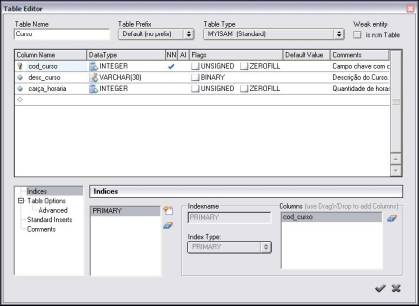 Um índice chamado PRIMARY é criado automaticamente para a chave da tabela, sendo possível definir mais índices de acordo com a necessidade. Para isto, é utilizada a parte inferior da janela apresentada na Figura 6. Para adicionar outros índices deve-se clicar sobre o botão com o símbolo , escolher o nome do índice e confirmar. É necessário definir qual campo vai ser indexado pelo índice criado, sendo possível criar um índice utilizando mais de um campo. Neste estudo de caso, a tabela Curso é indexada pelo campo desc_curso para que se possa ordenar e fazer buscas mais rapidamente através deste campo. Para isso, deve-se clicar sobre este campo e arrastá-lo até o canto inferior direito, denominado Columns.