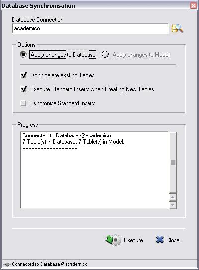Após ter feito esta configuração, deve-se clicar no botão OK para confirmar. E, na janela Select Database Connection, clica-se sobre o botão Connect para fazer a conexão com o banco. Surgirá uma nova janela (ver Figura 10) para que possam ser feitas algumas configurações em relação ao sincronismo, como não apagar as tabelas já existentes no banco de dados mesmo que tenham sido retiradas do modelo, dentre outras opções. Depois de ter personalizado estas configurações, deve-se clicar sobre o botão Execute. Neste ponto, a DBDesigner se encarrega de fazer toda a criação das tabelas do banco de dados ou o sincronismo entre o banco existente e o modelo. Um “log” é mostrado na janela com as informações das execuções feitas.