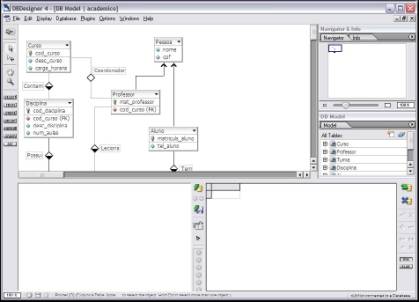 Para demonstrar as funcionalidades da DBDesigner, é apresentada a construção de um fragmento do modelo de dados de um sistema acadêmico, representando suas tabelas com atributos e relacionamentos, não tendo o objetivo de ser um exemplo completo.