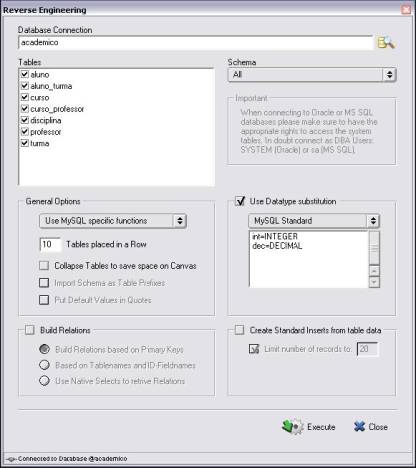 Como dito anteriormente no artigo, uma das características da DBDesigner é a possibilidade de se fazer engenharia reversa. A título de exemplo, será mostrado como fazer uma engenharia reversa utilizando o próprio banco gerado anteriormente. Para isso, deve-se selecionar o menu Database / Reverse Engineering na janela Select Database Connection, selecionando o banco de dados ao qual se quer conectar, e então clica-se no botão Connect. Uma janela é exibida para que possam ser feitas algumas configurações (ver Figura 12).