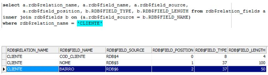 Para descobrimos o tipo de cada campo usado no primeiro exemplo, nós temos que fazer um Join entre RDB$RELATION_NAMES e RDB$FIELDS, respectivamente através das colunas RDB$FIELD_SOURCE e RDB$FIELD_NAME.