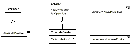 - Creator – declara o método fábrica o qual retorna um objeto do tipoProduct;
