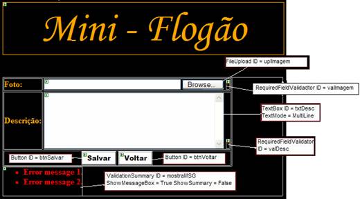 Agora vamos acrescentar outros controles para podermos salvar as fotos. Precisaremos de um FileUpload, um TextBox, um botão salvar e outro voltar como mostra a Figura 3, além dos controles de validação.