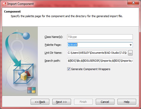 Feito isso, ao clicar no botão “Finish”, o pacote será criado, e executado, seu componente irá aparecer na palheta ActiveX :
