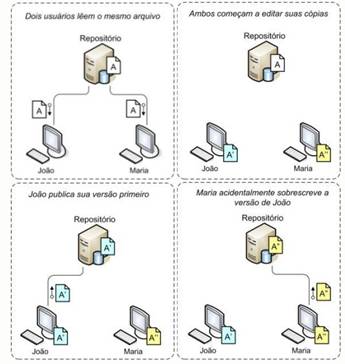 Imagine que agora foi acordado entre os desenvolvedores que o ideal seria centralizar os artefatos em um repositório e que cada desenvolvedor implementaria suas modificações em um espaço de trabalho privado. Após cada modificação, o artefato seria devolvido ao repositório. Considerando este cenário, freqüentemente ocorreriam sobreposições ou perdas de modificações implementadas nos artefatos comuns nas organizações sem a prática da Gerência de Configuração. Um desenvolvedor poderia implementar sua modificação em uma versão desatualizada do artefato e sobrepor a versão mais atual disponibilizada por outro. Este problema ocorre devido à atualização simultânea, quando dois desenvolvedores compartilham o mesmo repositório e não existe controle ou restrição quanto ao acesso a este repositório (ver Figura 2).