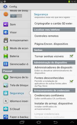 Você deverá ir até as configurações e procurar o item Segurança e marcar o checkbox Fontes desconhecidas, como na Figura 15. Depois é só você transferir o arquivo .apk que aprendemos a criar para que o dispositivo possa ir até o diretório onde ele está e executar.