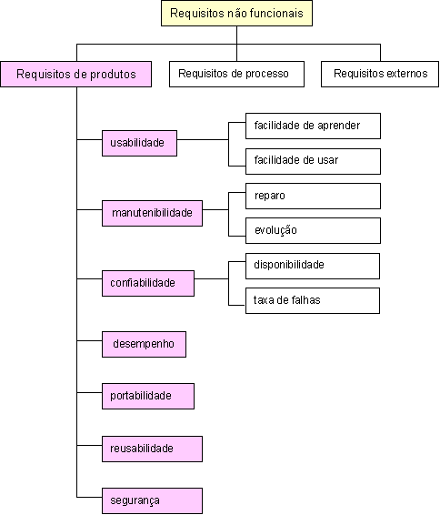 A Figura 2 é uma adaptação da proposta de Sommerville, onde consideramos os requisitos de produto, associados à arquitetura de software, bem como adicionamos outros não presentes na proposta original de Sommerville. É importante observar que a Figura 2 mostra um subconjunto de requisitos não funcionais, denominados de requisitos de produtos os quais estão associados à arquitetura de um sistema de software. Note que a classificação apresentada em [Sommerville 2007] ainda considera os requisitos de processo e requisitos externos como sendo requisitos não funcionais, além dos requisitos de produtos. A figura exibe um conjunto de 7 requisitos não funcionais, sendo alguns destes ainda decompostos.