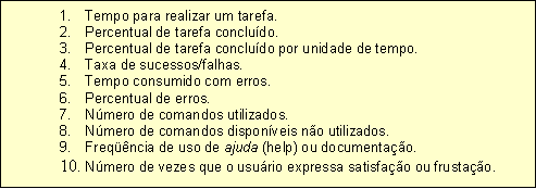 Esses requisitos de usabilidade podem ser expressos através de métricas de usabilidade, expressas em termos de medidas de desempenho. Tyldesley apresentou um conjunto de critérios que podem ser utilizados durante a medição de usabilidade [Tyldesley 1988]. A seleção de critérios a serem usados para mensurar a usabilidade depende do tipo de sistema. Exemplos de critérios de medição de usabilidade são apresentados na Figura 3.