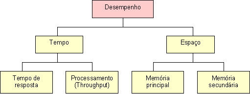 Adicionalmente, desempenho é importante porque afeta a usabilidade de um sistema. Se um sistema de software é lento, ele certamente reduz a produtividade de seus usuários ao ponto de não atender às suas necessidades. Também, se o sistema de software requer muito espaço em disco para armazenamento de informações, pode ser oneroso utilizá-lo. Por exemplo, se um sistema de software exige muita memória para ser executado, ele pode afetar outras aplicações que são executadas no mesmo ambiente. Além disso, ele pode executar tão lentamente que o sistema operacional tenta balancear o uso de memória entre as diversas aplicações. De um modo geral, o requisito de desempenho pode ser decomposto em termos de tempo e espaço, como ilustrado na Figura 4.