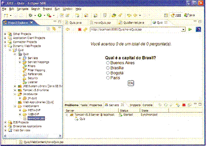 Dois recursos que não podem faltar em ferramentas de desenvolvimento e a possibilidade de executar e depurar aplicações. Para executar nossa aplicação dentro do WTP, clique na página novoQuiz.jsp com o botão direito e selecione a opção Run As> |Run on server. O WTP irá iniciar o servidor configurado para o projeto (caso ainda não esteja executando) e cuidar da sincronização dos arquivos do projeto com o contexto associado.