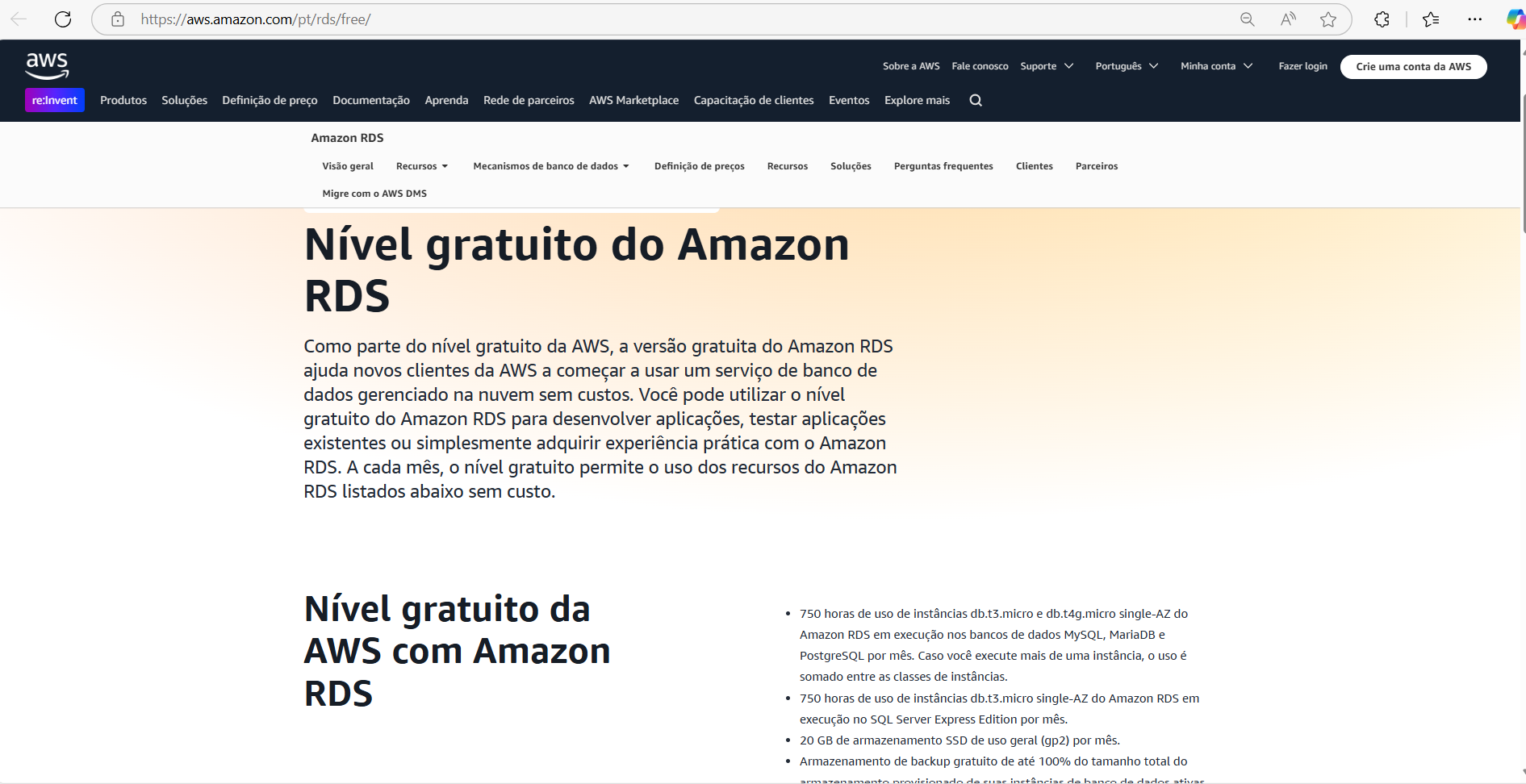 - Amazon RDS Free Tier (Relacional): 750 horas/mês em instâncias MySQL, PostgreSQL e MariaDB.