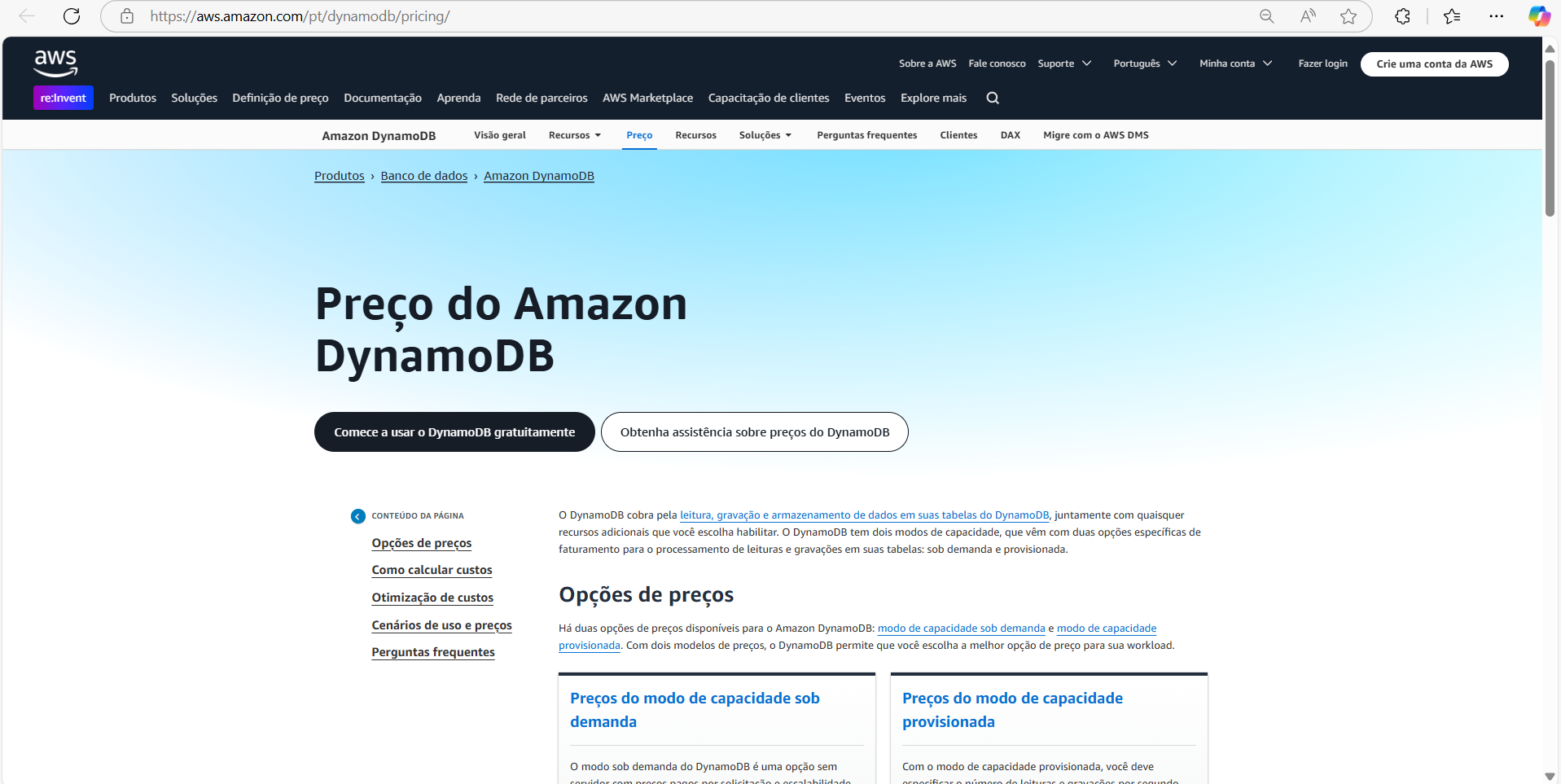 - Amazon DynamoDB Free Tier (noSQL): 25 GB de armazenamento e operações grátis.