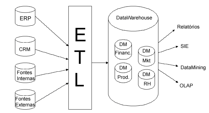 DataWarehouse (DW) armazena base de dados históricas da empresa, com informações de todos os departamentos (Marketing, Financeiro, Recursos Humanos, Produção), por ter um custo elevado o DW muitas vezes é dividido em partes menores chamadas de DataMarts (DM).