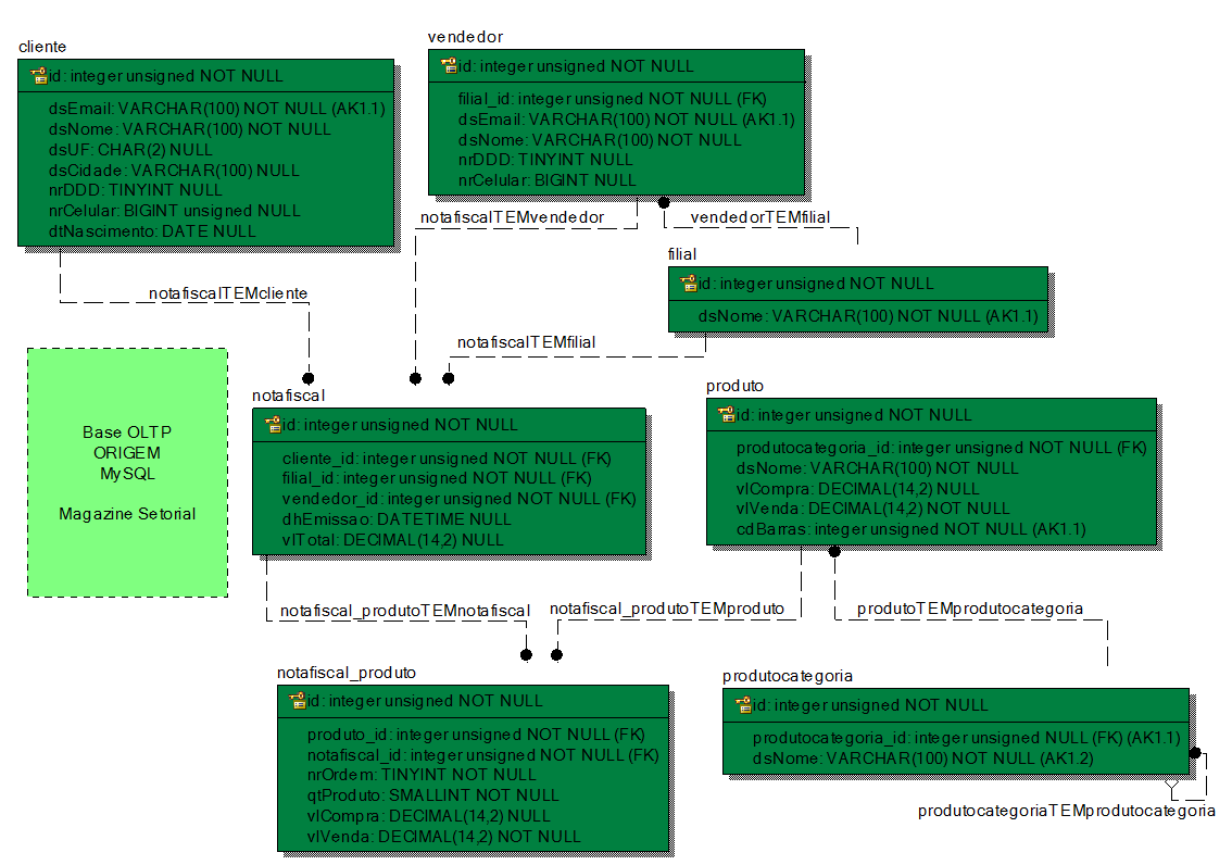Na Figura 2 é apresentado o Modelo de Entidade-Relacionamento (MER ou ER) da base que armazena os dados do sistema transacional, em MySQL. Esta estrutura armazena dados referentes às filiais e seus vendedores, além dos dados dos clientes e suas notas fiscais, com os produtos de cada compra. Percebe-se, além disso, que os produtos são sempre de uma categoria (gênero ou tipo) de produto, pois a tabela de produtos tem uma chave estrangeira apontando para a de categoria de produtos, sem aceitar nulos.