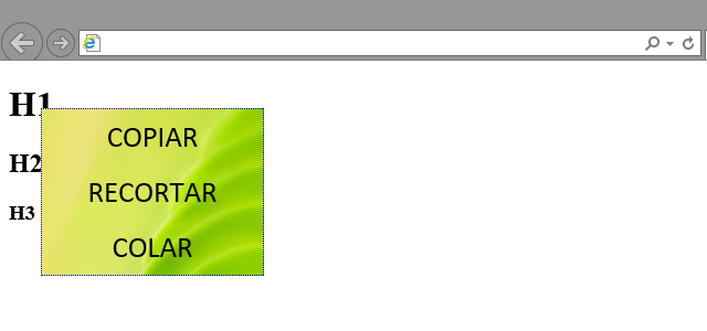 <!DOCTYPE html> <html> <head> <meta charset="utf-8" /> <title>Menu popup customizado</title> </head> <body> <div> <h1 id="hh1" oncontextmenu="mostrarMenu(); return false;">H1</h1> <h2 id="hh2">H2</h2> <h3 id="hh3">H3</h3> </div> <div id="divMenu"> <ul> <li>COPIAR</li> <li>RECORTAR</li> <li>COLAR</li> </ul> </div> </body> </html>