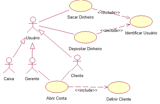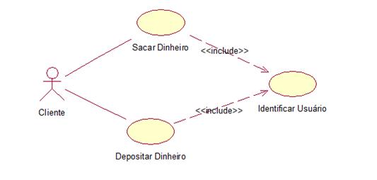 Essa característica significa que o caso de uso sempre será chamado. Como exemplo, na Figura 4, onde os casos de uso Sacar Dinheiro e Depositar Dinheiro incluem o caso de uso Identificar Usuário e o caso de uso Abrir Conta inclui Definir Cliente. Isso significa que os casos de uso Identificar Usuário e Definir Cliente sempre serão chamados quando Sacar Dinheiro, Depositar Dinheiro e Abrir Conta forem executados.