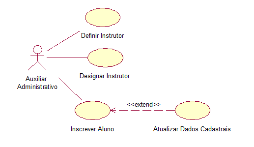Essa característica significa que o caso de uso poderá ou não ser executado, ou seja, dependerá do resultado de uma condição de negócio para ser decidido se ele será executado. Casos de uso que estendem são executados nos cenários alternativos (cenários alternativos serão detalhados mais para frente). Como exemplo, veja na Figura 6 que o Auxiliar Administrativo ao inscrever um aluno em um treinamento poderá ou não atualizar os dados cadastrais do aluno. Se for a primeira vez que o aluno é inscrito no treinamento, então ele será cadastrado. Se for o segundo treinamento em diante o aluno poderá ter ou não seus dados cadastrais atualizados.