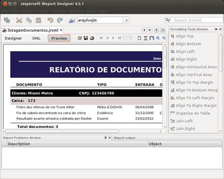 O iReport nos oferece a facilidade de realizar todas as configurações e formatações que faríamos diretamente no arquivo XML, além de permitir compilar, pré visualizar o relatório, entre outras funcionalidades, através de uma interface gráfica bastante amigável e intuitiva.