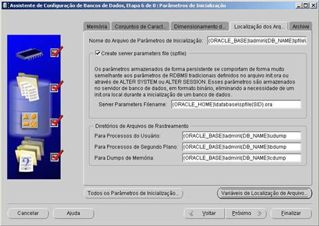 Cada BD criado possui processos que são executados em segundo plano, sem a percepção dos usuários ou até mesmo do DBA. Quando um processo detecta um erro interno, ele gera uma informação e a armazena em um arquivo de rastreamento (trace file) associado a ele. Essas informações podem auxiliar na abertura de um chamado de suporte técnico junto a Oracle e até mesmo servir como guia para ajustes finos (tuning) na instância ou mesmo em aplicações que interagem com o BD. Deixaremos selecionada a opção de criação do spfile e manteremos as opções sugeridas pelo DBCA para nomes de arquivo e localização dos mesmos (Figura 9).