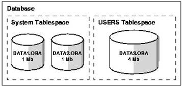 Cada BD é dividido logicamente em uma ou mais Tablespaces, que por sua vez pode conter um ou mais arquivos de dados (Data Files, que veremos na próxima etapa) para armazenar fisicamente todos os dados criados na estrutura lógica. A capacidade total de armazenamento da Tablespace será a somatória da capacidade de cada arquivo de dados. Conforme a Figura 12, a Tablespace USERS possui uma capacidade de armazenamento de 4 Mb enquanto a Tablespace SYSTEM possui 2 Mb (1 Mb + 1 Mb) de capacidade. A medida que a capacidade de armazenamento da Tablespace vai se esgotando, pode-se adicionar arquivos de dados à mesma, aumentando assim sua capacidade de armazenamento.