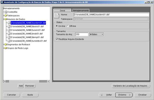 A Tablespace SYSTEM é obrigatória, pois nela está contido o dicionário de dados do BD, necessário para sua inicialização. O restante é configurado de acordo com a necessidade, criando-se Tablespace para dados dos usuários e outra exclusiva para índices, por exemplo. O DBCA já define algumas Tablespaces automaticamente, cabe a nós aceitar as sugestões ou, remover ou adicionar (botão “Add”) configurando alguns dos parâmetros do arquivo de dados (Figura 13).