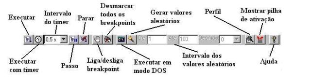 - Mostrar pilha de ativação (Ctrl-F3): Exibe a pilha de subprogramas ativados num dado momento. Convém utilizar este comando em conjunto com breakpoints ou com a execução passo a passo.