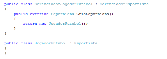 Com isso, você define a classe base que contém o factory method, as subclasses irão herdar dela, e terão a responsabilidade de decisão, sobre qual produto concreto irão instânciar; reduzindo o acoplamento e o custo de manutenção no software. No caso do exemplo, se o esportista mudar, basta apenas criar uma subclasse que crie este tipo concreto, mais a base se mantém a mesma. Veja abaixo a definição formal do padrão: