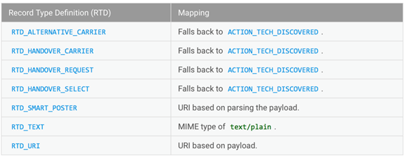 Quando um device Android lê uma mensagem gerada por uma tag no formato NDEF, o primeiro passo é identificar na mensagem o MimeType ou a URI, o qual informará ao device como esta mensagem deverá ser tratada. Muitas vezes, um dado que vem de uma tag NFC possui uma URI (por exemplo, abrir o aplicativo do YouTube), assim como uma informação (o vídeo que deve ser executado), desta forma, de forma transparente para o usuário, um aplicativo é aberto e um dado compatível com este aplicativo é apresentado.