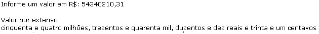 Fazer um recibo ou cheque de pagamento com o valor por extenso, emitir uma nota fiscal de venda apresentando o total do documento por extenso, são alguns exemplos de situações que sugerem a necessidade de uma aplicação comercial para definir um valor monetário em reais por extenso.