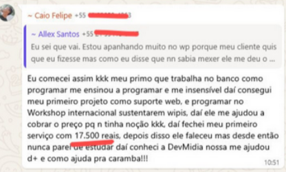Ou seja, a DevMedia simula um cenário real, te treinando na parte técnica e na parte comercial para você ir ao mercado conquistar clientes e gerar renda.
