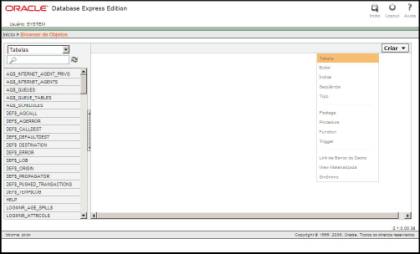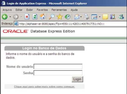 Após realizar o download do banco de dados e seguir todos os passos até a finalização da instalação, será instalado um software que irá auxiliar na administração do banco de dados, seja de forma local ou remota, chamado Oracle Application Express. Para acessá-lo, basta ir em Iniciar -> Programas -> Oracle Database 10g Express Edition -> Ir para a Home Page de banco de dados.
