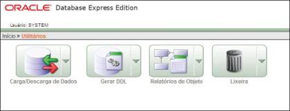 Algumas das principais funções da plataforma 10g estão aqui, como, Recycled Bin (Lixeira), Geração de DDL (Códigos de objetos), Exportação e Importação de dados em TXT ou XML e relatórios de objetos de usuários ou do banco de dados, como mostra a Figura 6.