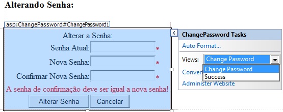 Agora vá à AlterarSenha.aspx, arraste da ToolBox o ChangePassword e altere as propriedades para que os textos do seu controle fiquem parecidos com o da imagem a seguir: