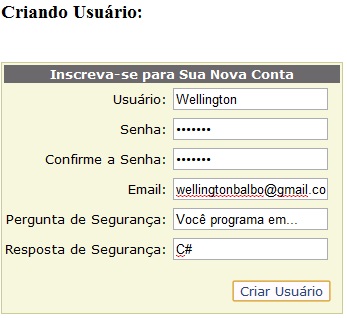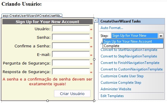 Primeiro, na página de criação de usuário, arraste da ToolBox o CreateUserWizard e altere as propriedades para que os textos do seu controle fiquem parecidos com o da imagem a seguir:
