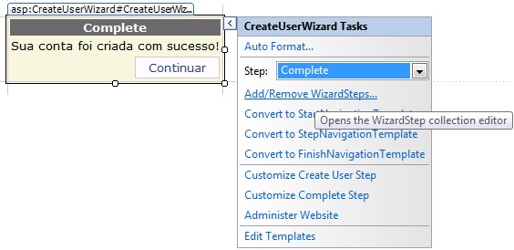 Perceba que, se clicarmos na opção Add/Remove WizardSteps... podemos alterar os nomes desses passos, adicionar outros ou mesmo remover os existentes. Altere-os para português se quiser. Esse controle é fácil de ser customizado, podemos adicionar diversos steps (passos) a ele, alterar as perguntas, os valores, etc.