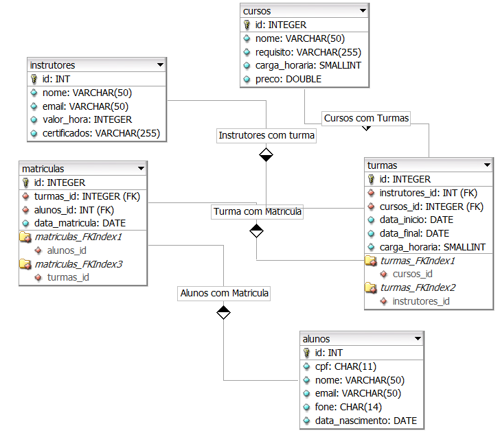 Um curso possui nome, requisito, carga horaria e preco. O requisito são os conhecimentos necessário que o aluno deve possuir, a carga horaria é o tempo do curso e por fim o valor do mesmo. Em seguida você possui uma tabela de instrutores, matriculas, alunos e turmas. De importante é comentar que na tabela de matriculas existe um relacionamento para a tabela de turmas. Onde para se possuir uma matricula é preciso ter um turma em aberto, e também na matriculas existe um campo que relaciona com aluno, onde para se ter uma matricula também é necessário ter aluno. Outro pronto importante, é que na tabela de turma, foi replicado o campo carga_horaria. Se pensarmos bem, veja que turma se relaciona com cursos e o mesmo já possui o campo carga_horaria, por que a repetição? Na prática o curso um dia pode ser modificado sua carga horaria e isso iria prejudicar e muito informações a fins de relátorios.