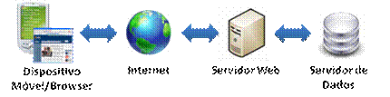 No dispositivo móvel temos um browser, que através da Internet, acessará nossa aplicação que por sua vez está localizada em um servidor (Servidor Web). E a aplicação acessará os dados que estão em um servidor de dados. Perceba que a estrutura é exatamente igual a de uma aplicação Web para Desktop, com a diferença que ela será acessada através do browser de um dispositivo móvel.