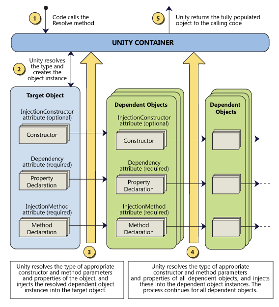 O Unity é parte da Enteprise Library, mas pode também ser utilizado sem ela. Ele é um container de injeção de dependência, que tem a responsabilidade de resolver as dependências em uma hierarquia de classes, ou seja, ele vai verificar as dependências e construir os objetos baseado nas mesmas. O Unity também pode ser usado para interceptação, no caso de quem trabalha no estilo AOP. Ele pode resolver uma cadeia de dependências inteira como também resolver as dependências de objetos que não foram construídos por ele. Observe a figura abaixo: