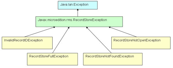 O RMS define várias exceções relacionadas ao acesso aos dados. Todas elas pertencem ao pacote javax.microedition.rms. Veja a Figura 1.