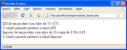 Para exemplificar melhor e entendermos o que foi dito, vamos criar um exemplo simples. Crie três scripts separados com os nomes Imposto.php, ISS.php e resultados_classes.php. Digite o código de cada um de acordo com as Listagens 1, 2, e 3 e salve-os dentro do mesmo diretório. Use o Bloco de Notas do Windows ou qualquer outro editor de sua preferência, como o Dreamweaver da Adobe, por exemplo.