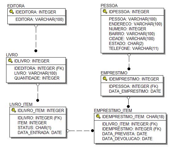 A Figura 2 mostra o relacionamento entre as tabelas do nosso sistema de bibliotecas, que basicamente é composto por pessoas, editoras, livros e seus itens. A explicação para a tabela de itens de livros se deve ao fato de que um mesmo livro possui várias cópias, e cada uma delas um código que identificará sua disponibilidade, e por último a tabela de empréstimos com seus itens.