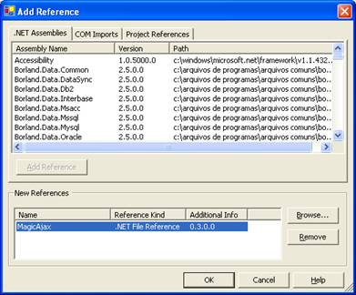 Na tela de Add Reference, com a aba .NET Assemblies selecionada, clique no Browse e encontre o arquivo MagicAjax.dll a partir do diretório onde você o descompactou. Clique em OK para fechar o editor (Figura 1).
