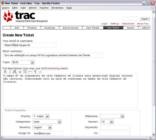 No endereço www.hosted-projects.com/trac/TracDemo/Demo podemos testar a ferramenta através de um demo. Para reportar um erro, clique no menu New Ticket. Na Figura 1 vemos como a estrutura do Trac é bem simples, utilizando os campos: