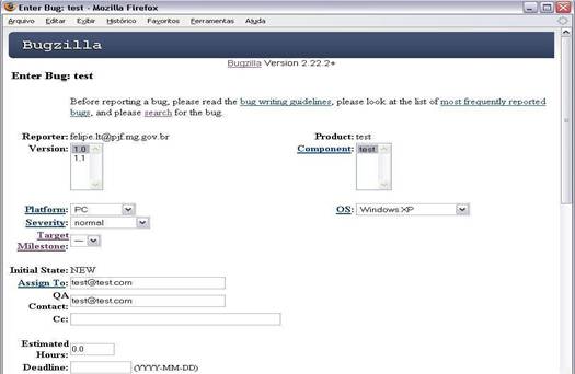 No endereço landfill.bugzilla.org/bugzilla-2.22-branch podemos testar a ferramenta através de um demo. Primeiramente, para reportar um erro é necessário criar uma conta no Bugzilla, depois clicar em Enter a new bug>test product, conforme Figura 2.