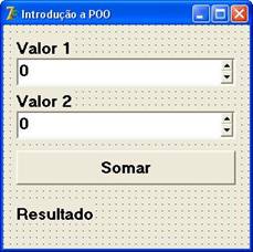 Insira em nosso frmPrincipal dois componentes do tipo SpinEdit da paleta Samples. Modifique o Name desses componentes para “speValor1” e “speValor2”, respectivamente. Em seguida adicione um Button(“btnCalcular’) da paleta Standard. Por último acrescente um Label(“lblSoma”) também da paleta Standand. Se preferir, insira outros Labels acima dos SpinEdits e modifique seus respectivos Captions para “Valor