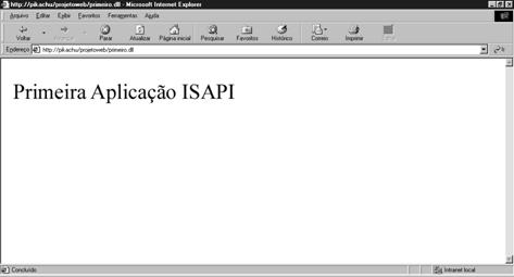 A Figura 13 ilustra a nossa primeira aplicação exemplo, onde mostramos uma mensagem criada através de um objeto ActionItem. A frase exibida pelo browser é o resultado gerado pela nossa ISAPI.