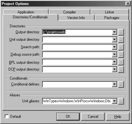 Grave seu projeto com o nome Primeiro.dpr e a unit como Unit1.pas. Em seguida (antes de compilar o projeto) devemos configurar o Delphi para gerar a aplicação DLL dentro da Pasta ProjetosWeb. Para isso, selecione a opção Project/Options e clique na aba Directories/Conditionals.