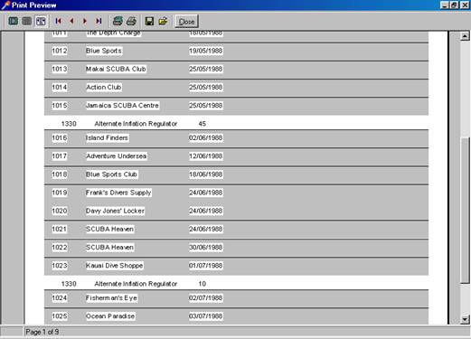 Mas ainda existem algumas peculiaridades. No exemplo que acabamos de construir, o filtro é realizado sobre a banda pai, que representa a tabela de pedidos (orders). Como a tabela orders é filtrada, automaticamente os filhos que não pertencem ao filtro são excluídos, pois temos um relacionamento entre os objetos Ttable – vide a propriedade MasterSource e MasterFields dos objetos. O problema aparece quando temos que realizar o filtro sobre a tabela filho. Se o nosso relatório evoluísse para a questão: “Quero visualizar todas as compras do produto X em determinado período, visualizando o número do pedido, o cliente, a data e a quantidade”. Preste atenção e perceba que estamos falando do mesmo relatório. A única diferença é que teremos que filtrar a tabela tbItems para exibir somente os pedidos que contenham determinado produto. Vejamos o que isso significa na prática.